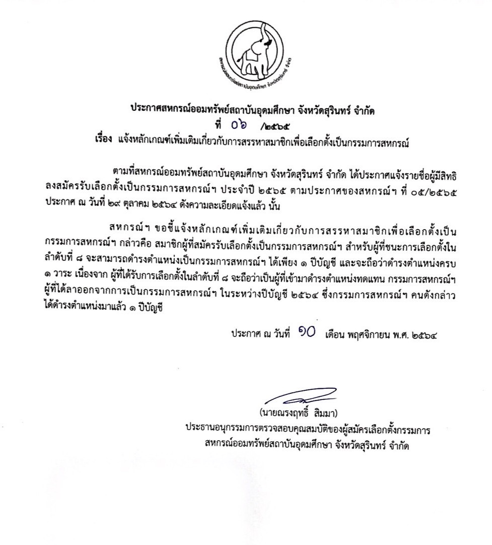 สหกรณ์ขอชี้แจงหลักเกณฑ์เพิ่มเติม เกี่ยวกับการสรรหาสมาชิกเลือกตั้ง เป็นกรรมการสหกรณ์ฯ สำหรับสมาชิกผู้ที่สมัครรับเลือกตั้งเป็นกรรมการสหกรณ์ฯ ที่ชนะการเลือกตั้งในลำดับที่ 8 จะสามารถดำรงตำแหน่งเป็นกรรมการสหกรณ์ฯ ได้เพียง 1 ปีบัญชี และจะถือว่าดำรงตำแหน่งครบ 1 วาระ รายละเอียดตามประกาศแนบท้ายนี้