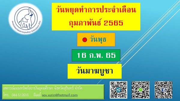 สหกรณ์ออมทรัพย์สถาบันอุดมศึกษา จังหวัดสุรินทร์ จำกัด ประชาสัมพันธ์วันหยุดประจำเดือน กุมภาพันธ์ 2565
