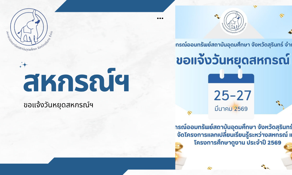 สหกรณ์ออมทรัพย์สถาบันอุดมศึกษา จังหวัดสุรินทร์ จำกัด ประชาสัมพันธ์วันหยุดเนื่องจากสหกรณ์ฯ จัดโครงการ แลกเปลี่ยนเรียนรู้ระหว่างสหกรณ์และโครงการศึกษาดูงาน ประจำปี 2569 จึงประกาศหยุดทำการ ดังนี้