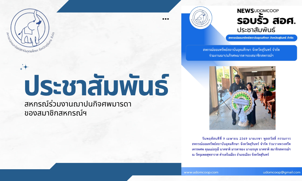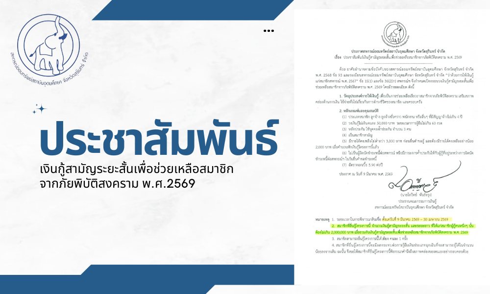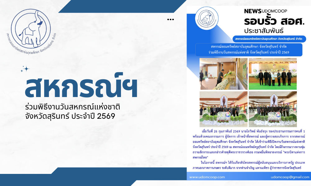 เมื่อวันที่ 26 กุมภาพันธ์ 2569 นายโกวิทย์ พันธ์จรุง รองประธานกรรมการคนที่ 1 พร้อมด้วยคณะกรรมการ ผู้จัดการ เจ้าหน้าที่สหกรณ์ และผู้ตรวจสอบกิจการ จากสหกรณ์ออมทรัพย์สถาบันอุดมศึกษา จังหวัดสุรินทร์ จำกัด