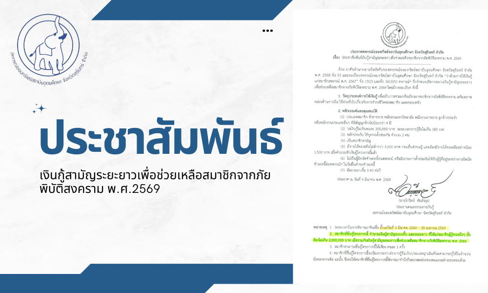 สหกรณ์ออมทรัพย์สถาบันอุดมศึกษา จังหวัดสุรินทร์ จำกัด ประชาสัมพันธ์วันหยุดประจำเดือน มีนาคม 2569 ตามระเบียบฯ ของสหกรณ์